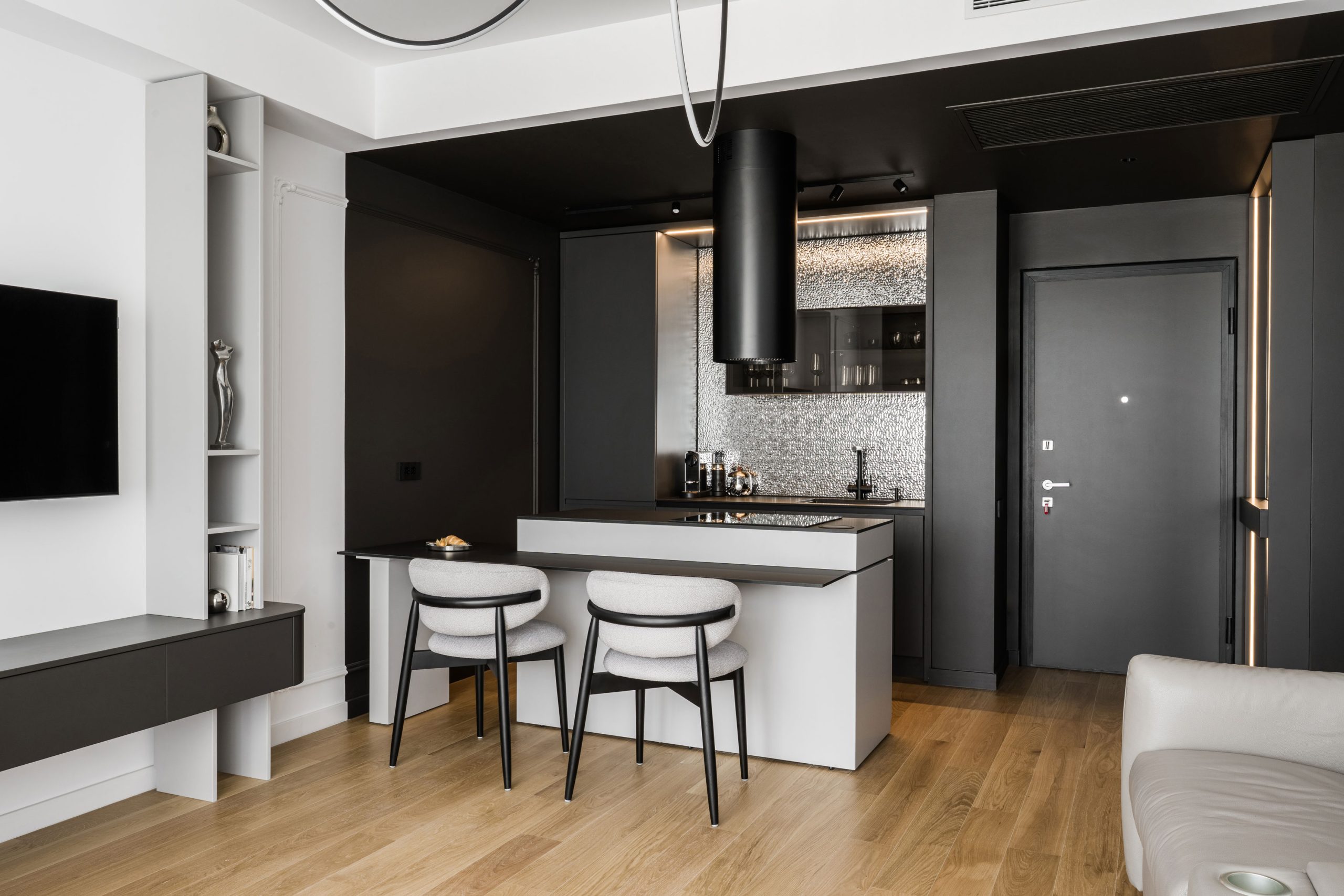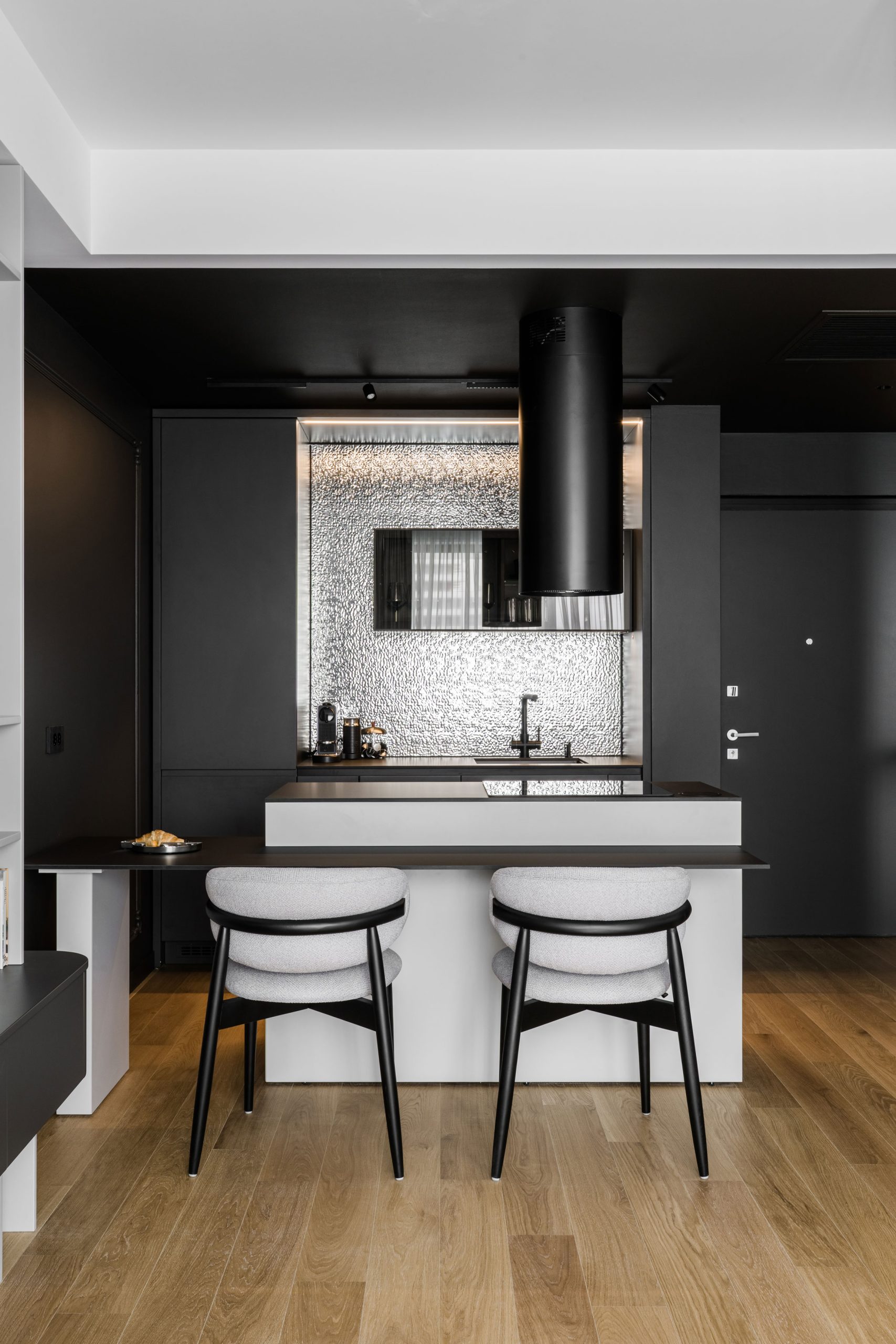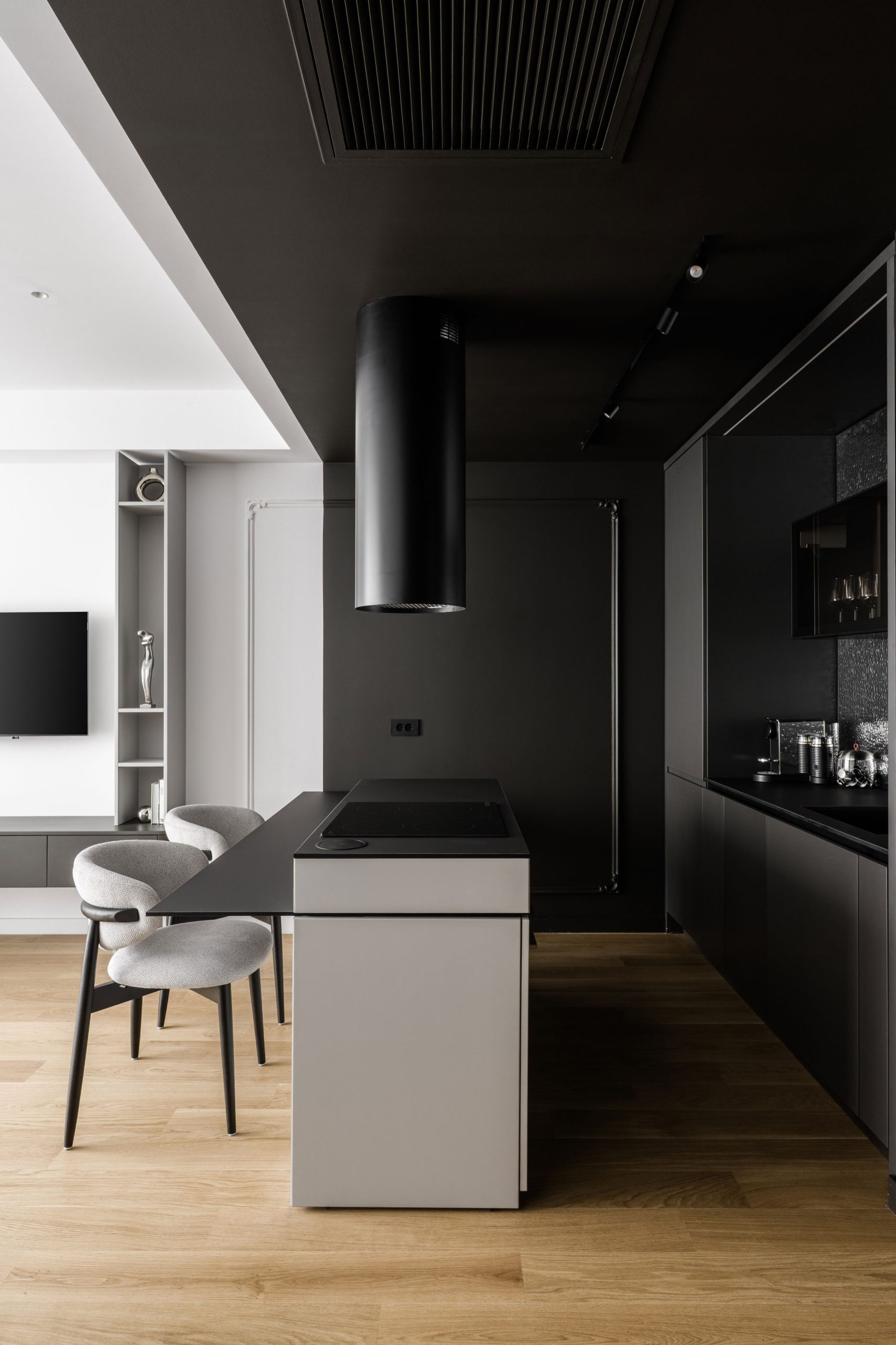 O amenajare în care estetica și funcționalitatea se întâlnesc într-un echilibru atent controlat. Paleta neutră de alb, gri și negru devine un instrument de integrare subtilă a spațiilor de depozitare, reducând impactul vizual și permițând arhitecturii interioare să respire.