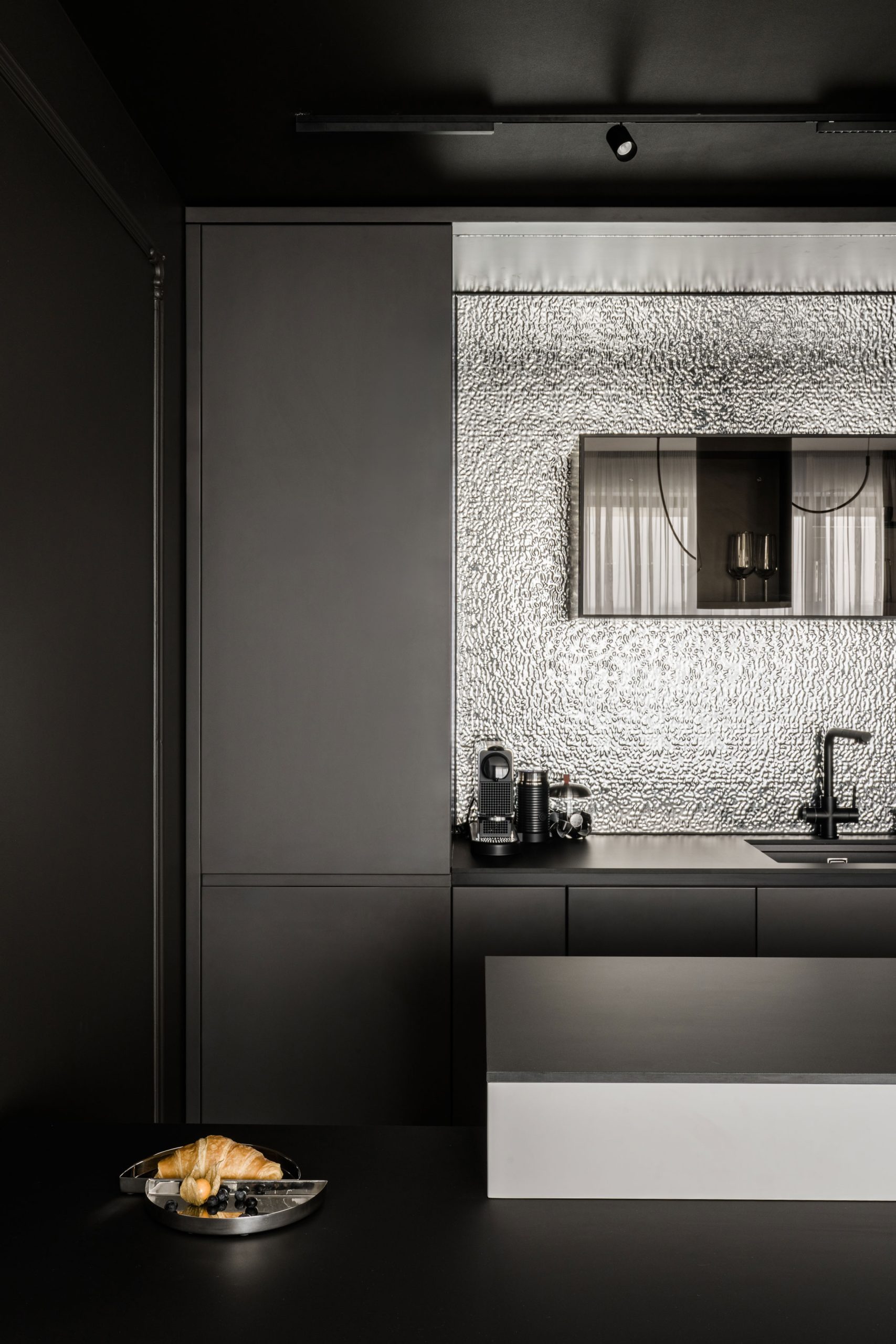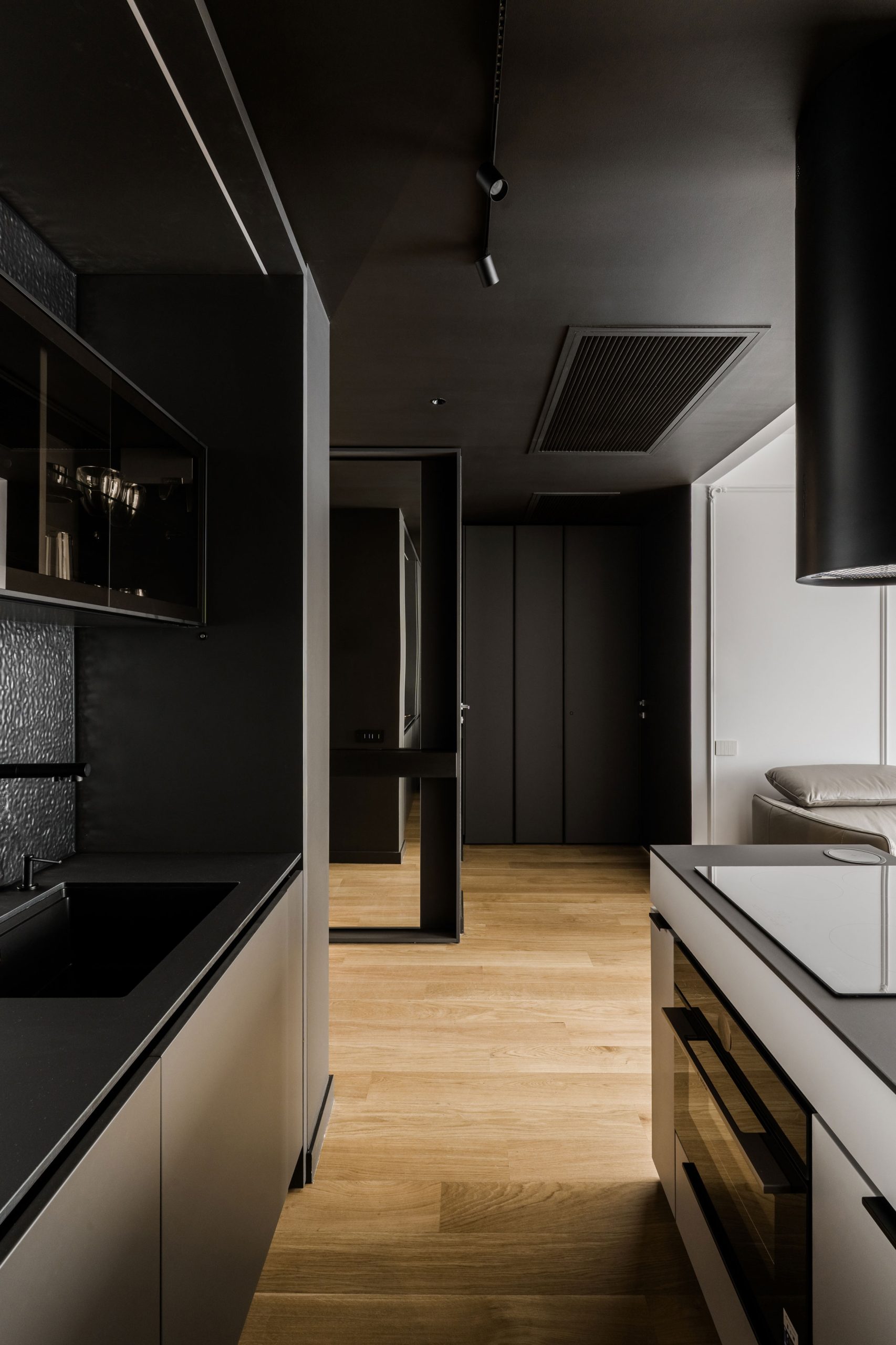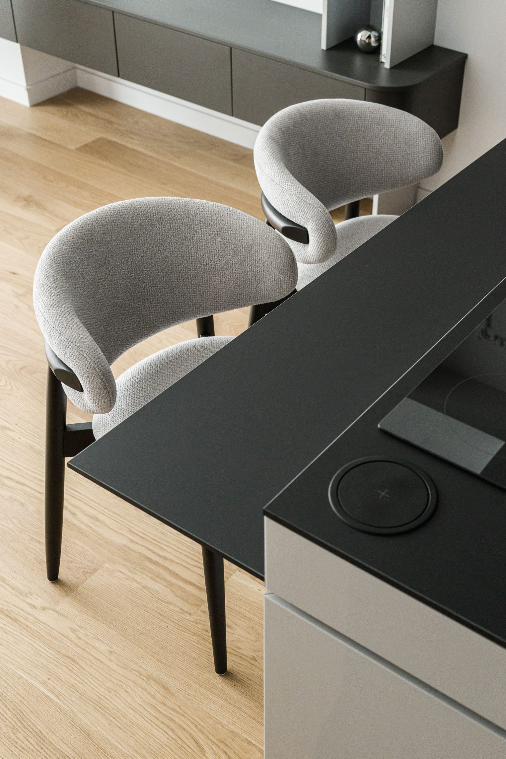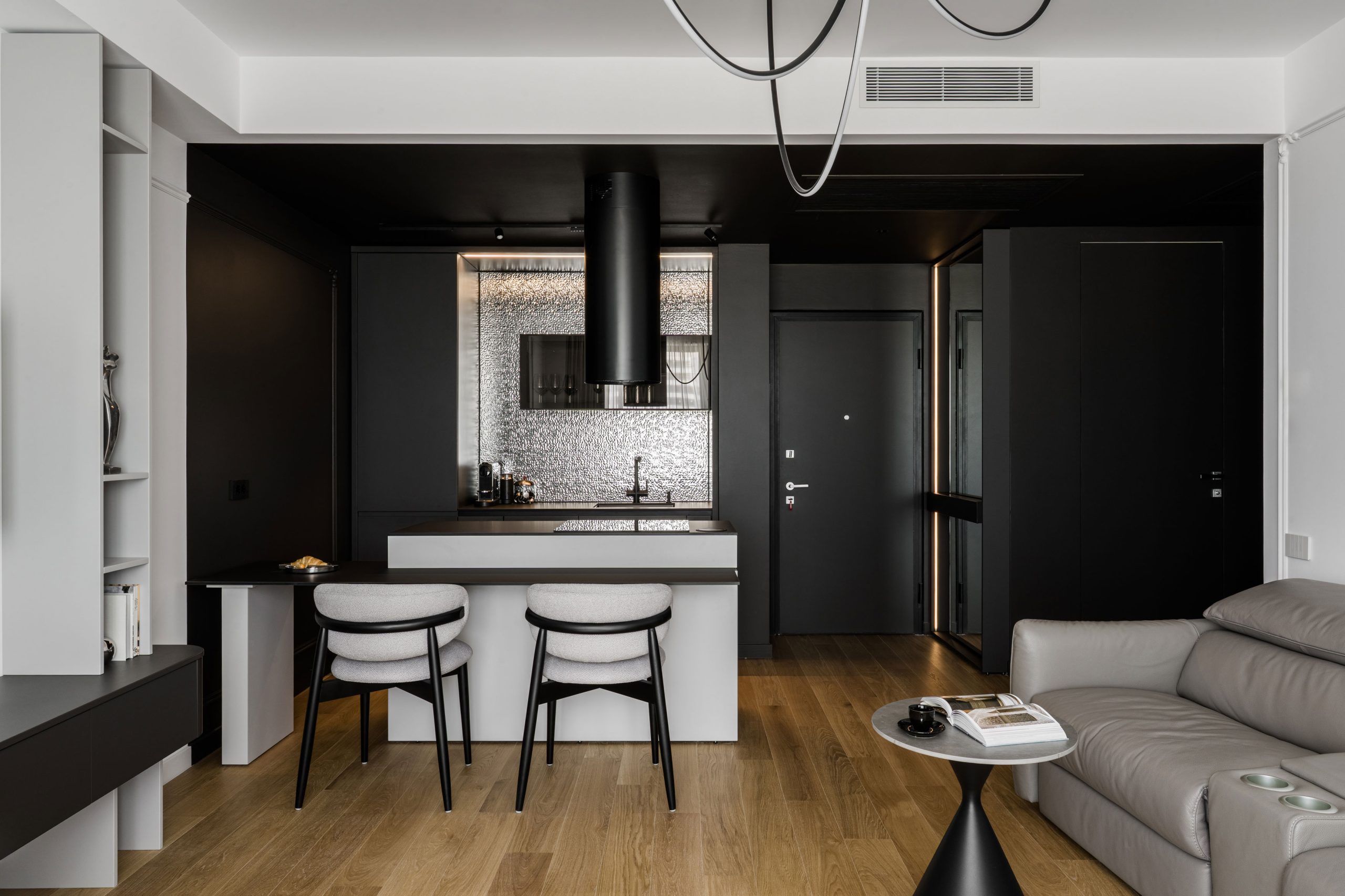 O amenajare în care estetica și funcționalitatea se întâlnesc într-un echilibru atent controlat. Paleta neutră de alb, gri și negru devine un instrument de integrare subtilă a spațiilor de depozitare, reducând impactul vizual și permițând arhitecturii interioare să respire.