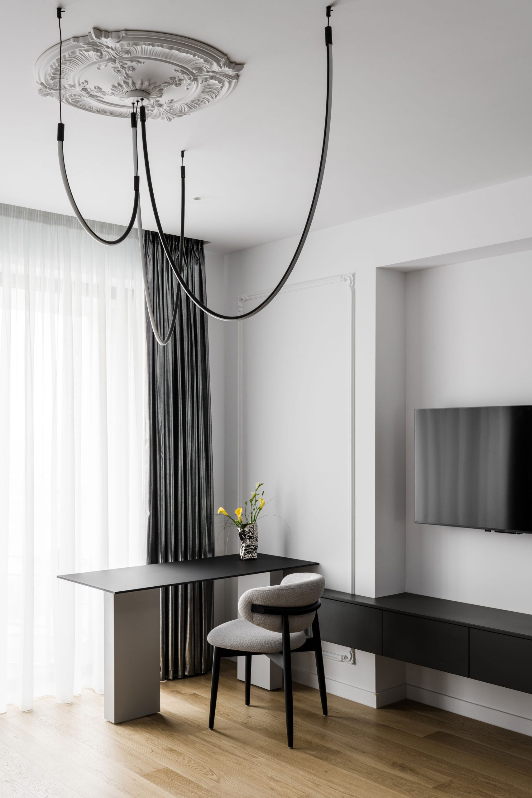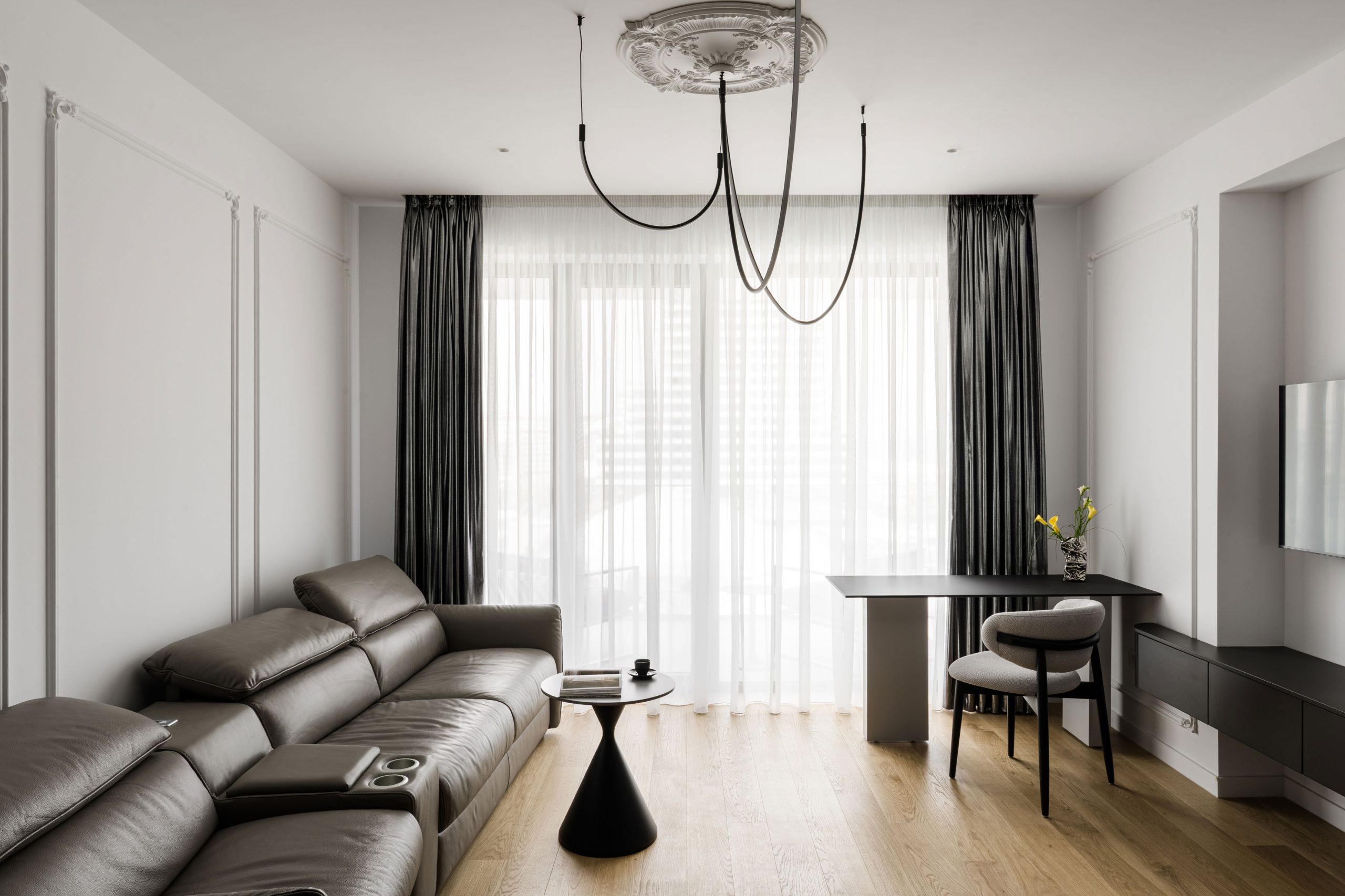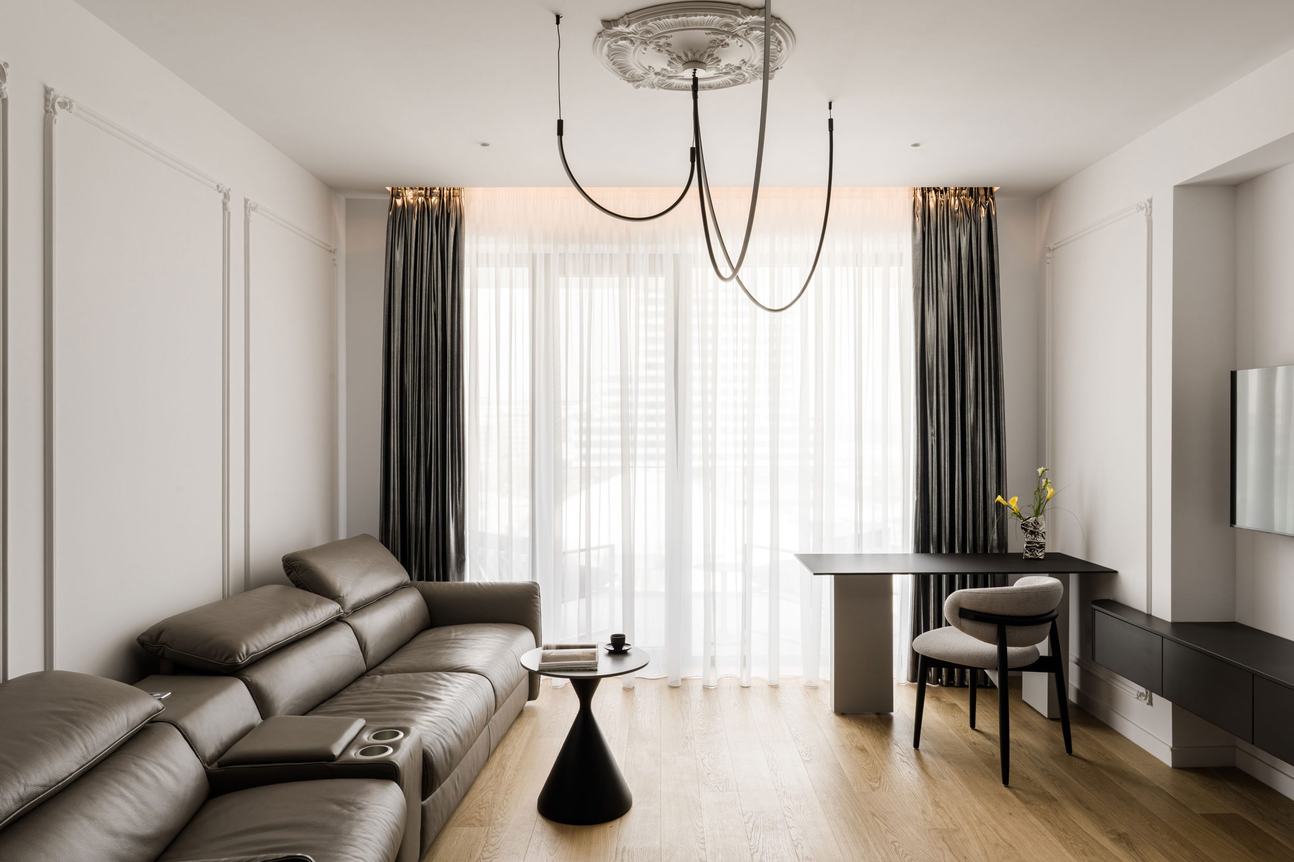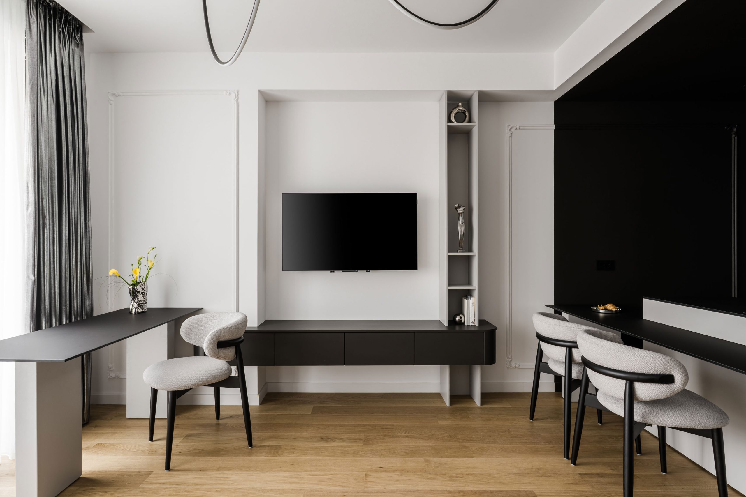 Lumina devine instrumentul care regizează spațiul, asemenea reflectoarelor unei scene de teatru. Fiecare scenariu de iluminat transformă interiorul, dezvăluind sau estompând volumele, accentuând profilele decorative și construind atmosfere diferite de-a lungul zilei. De la claritatea luminii diurne, care pune în valoare arhitectura și echilibrul monocrom, până la iluminatul ambiental al serii, unde umbrele și contrastele creează intimitate, spațiul se reinventează constant. Astfel, interiorul nu este doar locuit, ci trăit ca o succesiune de cadre scenografice, în care lumina spune povestea fiecărui moment.