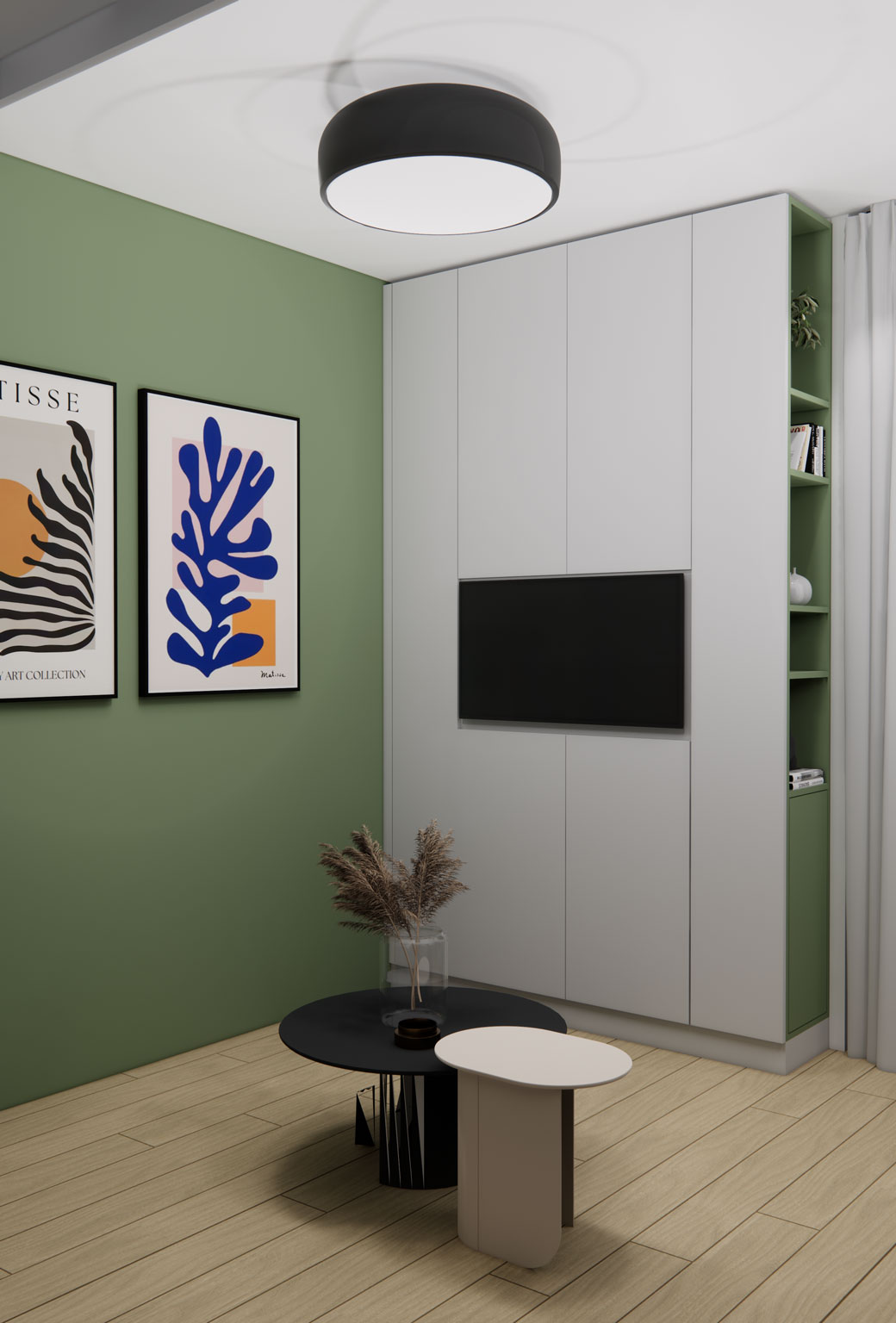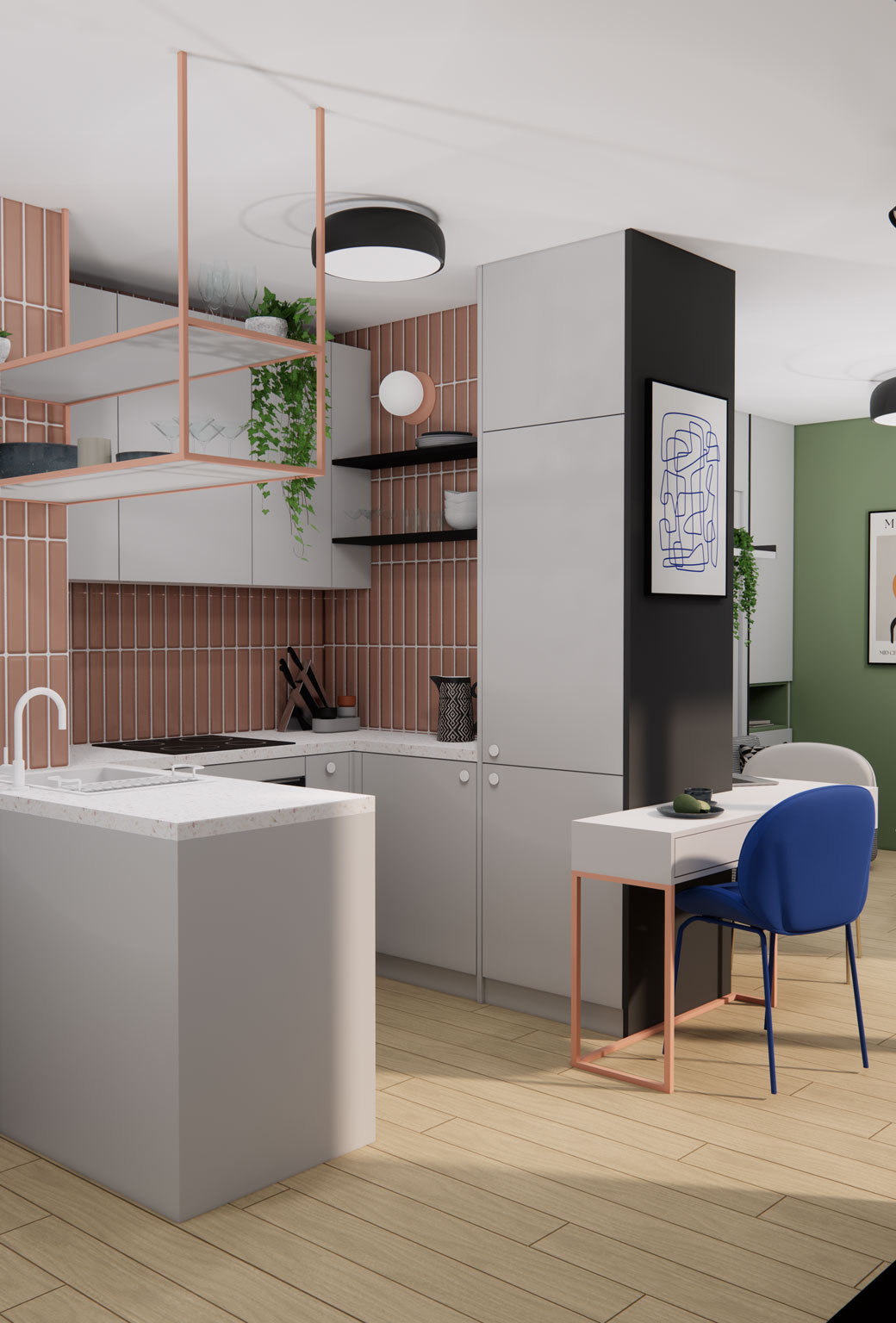 Deși suprafața este restrânsă, studioul oferă toate spațiile necesare activităților zilnice: spații de depozitare, bucătărie cu loc de luat masa, spațiu de lucru (birou), zonă living – care se transformă în zonă de dormit prin folosirea unui Murphy Bed.